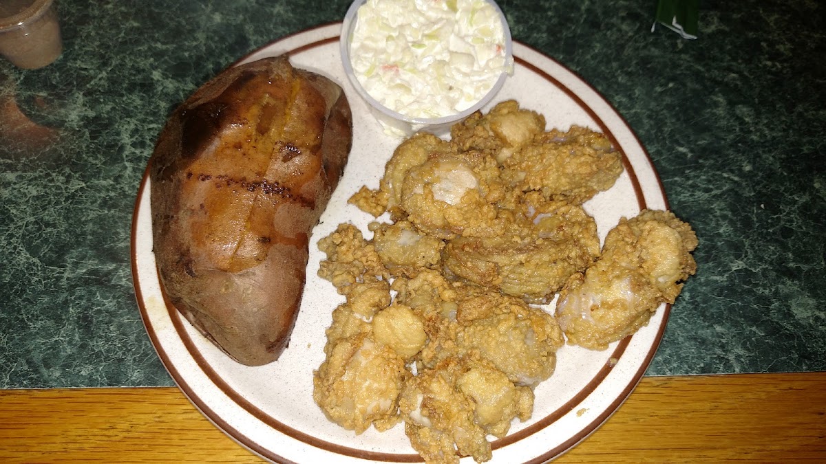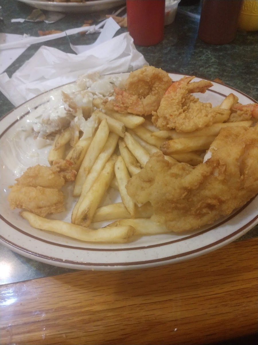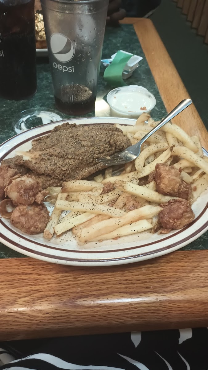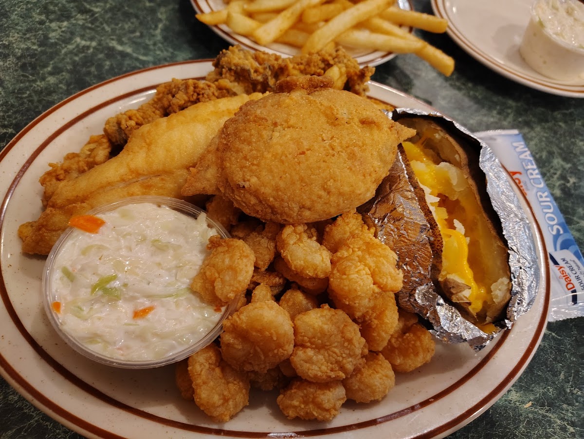 Phenomenal hidden gem that is a staple and favorite for their community! My Husband & I had passed here about once a month or so for a year and always said we'd stop in if we ever had time during business hours; as it's about an hour West of his workplace. My Sweetheart surprised me and took me for my birthday! The free hush puppies while we waited for our dinner, were delicious! We both had fried platters; the large fantail shrimp scallops and crab cakes were off the charts!! Even their French fries were hot and yummy! The seating and service was quick, cozy, comfortable and our waitress was kind, helpful and prompt. The restaurant was decorated with sea life art and pictures and really pretty! The prices were very fair and much lower than average too! We definitely recommend dining here but hopefully not to bring in too many as it is now our go-to for seafood! Wish I had taken pictures..