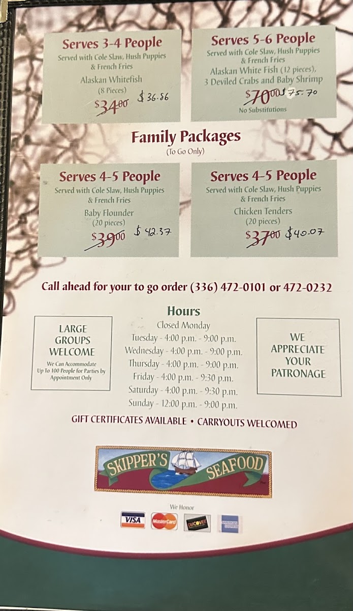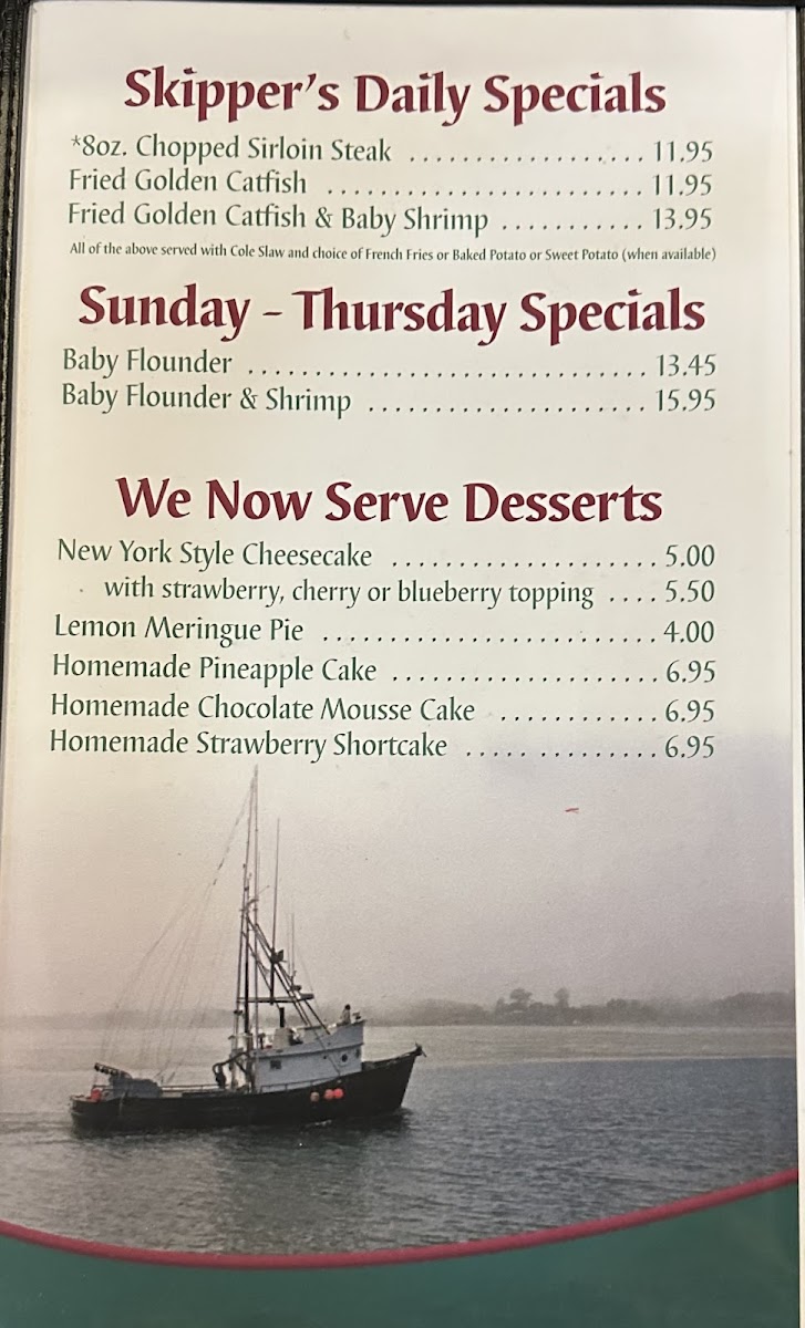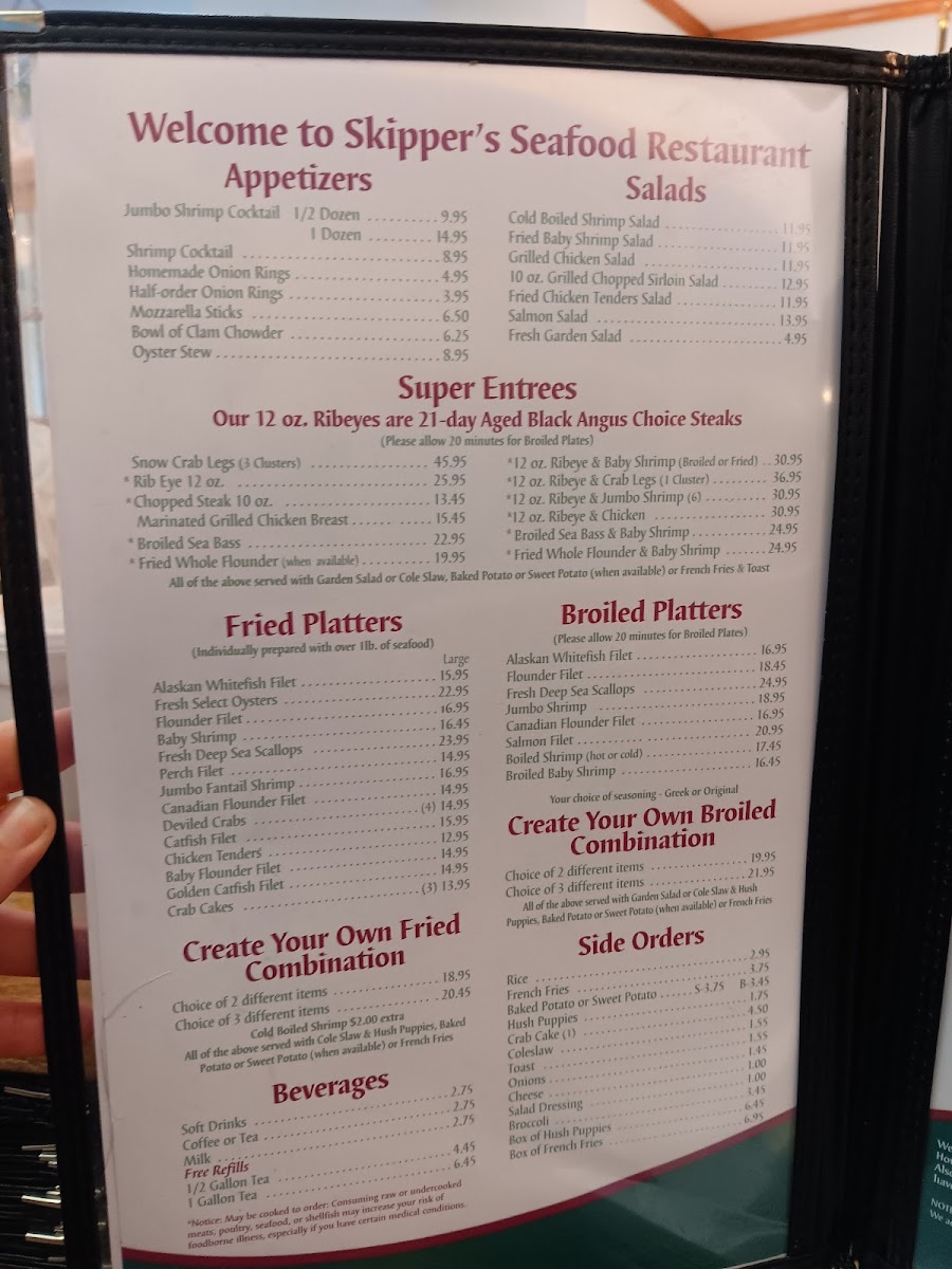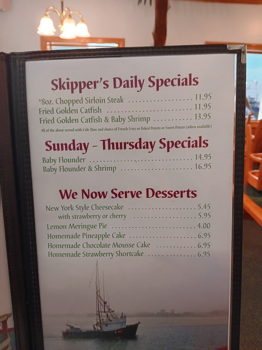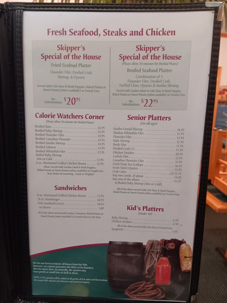 Skipper's Seafood Restaurant offers a straightforward, comforting menu centered around fresh, classic seafood and familiar family favorites. The dishes are crafted for casual dining, whether you're stopping by for a hearty lunch or settling in for a relaxed dinner with loved ones. The menu features a variety of fried platters like golden catfish, baby shrimp, and deep sea scallops, alongside grilled options and comforting sides such as hush puppies and fries.
